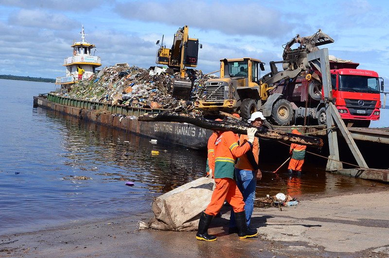 A Prefeitura de Manaus realizou, neste domingo (13), o transbordo de toneladas de resíduos retirados dos rios e igarapés da cidade nos últimos 30 dias.