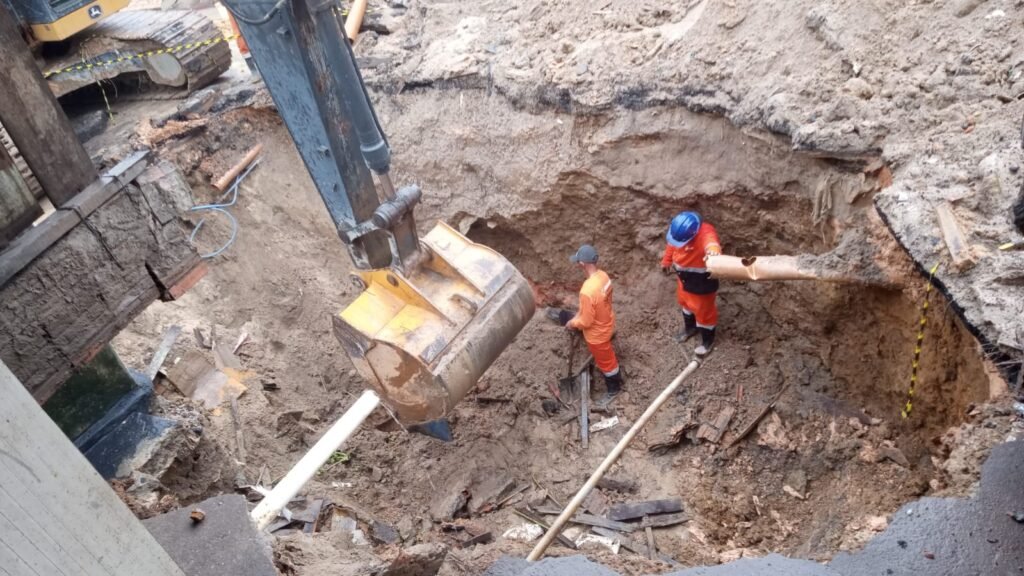 Em decorrência dos eventos climáticos, o solo apresenta riscos à estabilidade da escavação. Assim, a frente de obra é realizada com cautela, priorizando a segurança e integridade física dos servidores e moradores, conforme os padrões técnicos e de segurança.