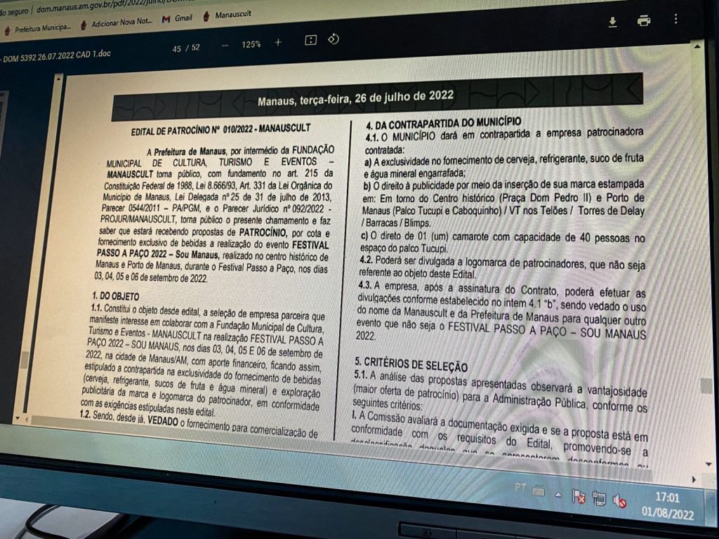 O edital dispõe sobre a seleção de empresa parceira que manifeste interesse em colaborar com a Manauscult na realização do festival “#SouManaus Passo a Paço 2022”, com aporte financeiro, ficando estipulado a contrapartida na exclusividade do fornecimento de bebidas (cerveja, refrigerante, sucos de fruta e água mineral) e exploração publicitária da marca e logomarca do patrocinador, em conformidade com as exigências estipuladas no edital. No último dia do festival, 6 de setembro, fica vedado o fornecimento para comercialização de bebida alcoólica, uma vez que o público presente no festival será infantil e gospel.