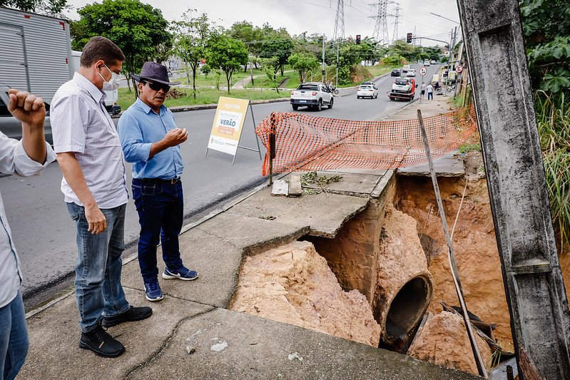 “A tubulação de drenagem foi descalçada, o que provocou uma erosão do material e rompeu as tubulações de drenagem”, explicou o subsecretário Efrain Aragão. Ainda segundo ele, a Amazonas Energia também esteve no local para fazer a mudança de posição do poste de energia, comprometido pela calçada, que cedeu com o trecho erodido da rua.