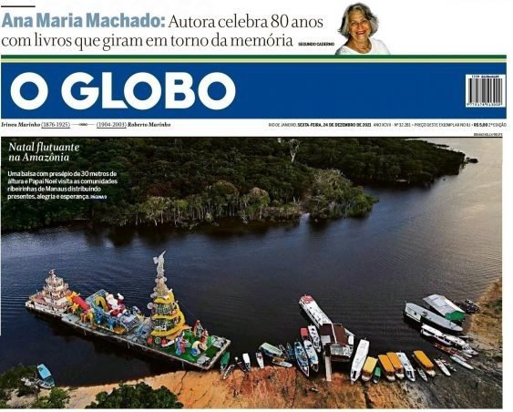 A imagem do presépio ancorado na comunidade ribeirinha Nossa Senhora de Fátima, durante visita para distribuição de presentes e alimentos na última quarta-feira (22), foi replicada e virou capa da edição de ontem do jornal carioca “O Globo”. Dentro do jornal, a reportagem enaltece a iniciativa inédita da Prefeitura de Manaus de levar o espírito natalino a população ribeirinha da Amazônia em uma balsa.
