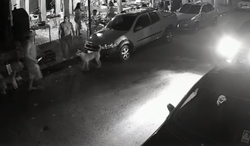 Um homem que estava no local atinge Alberto com um objeto, momento em que ele para de esfaquear o cachorro.