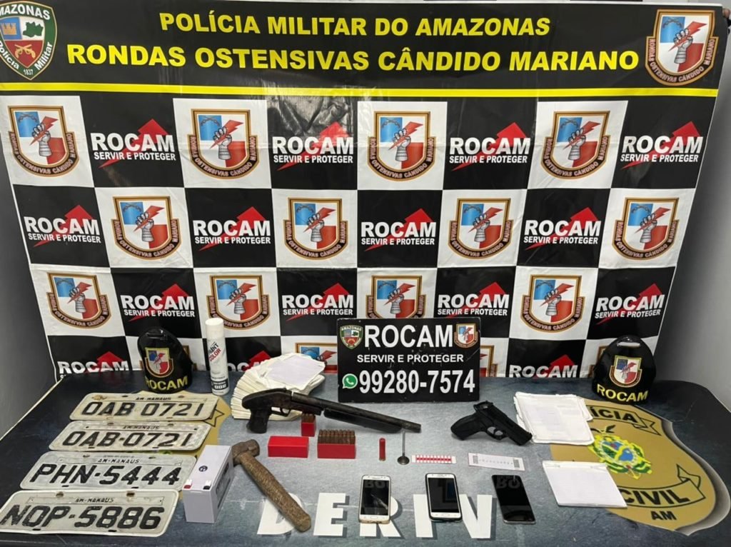 Os militares também apreenderam com eles, três veículos; uma arma de fogo calibre 28, sem marca ou numeração aparente; um simulacro de arma de fogo tipo pistola; uma munição calibre 28 intacta; três aparelhos celulares; um talão de remarcação veicular; e um grupo marcador alfanumérico de chassi.