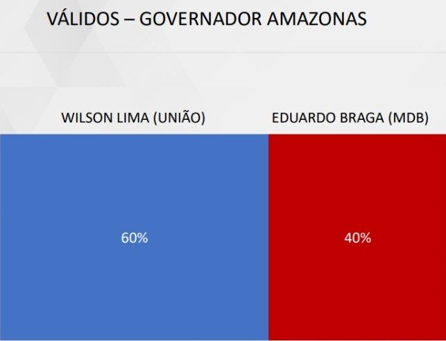 Pesquisa Real Time Big Data, divulgada nesta quinta-feira (27), aponta o governador e candidato a reeleição, Wilson Lima (União Brasil) com 20 pontos percentuais de vantagem contra o seu adversário Eduardo Braga (MDB. O atual chefe do Executivo amazonense aparece com 60% dos votos válidos e o senador medebista com 40%.