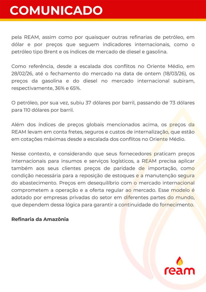 De acordo com a Ream, a guerra no Oriente Médio promovida pelos Estados Unidos e Israel contra o Irã, provocou escassez de petróleo e combustíveis, o que resultou no aumento de preços, mas ressalva que “não atua de forma isolada no abastecimento e nem na formação de preços dos combustíveis na região.”