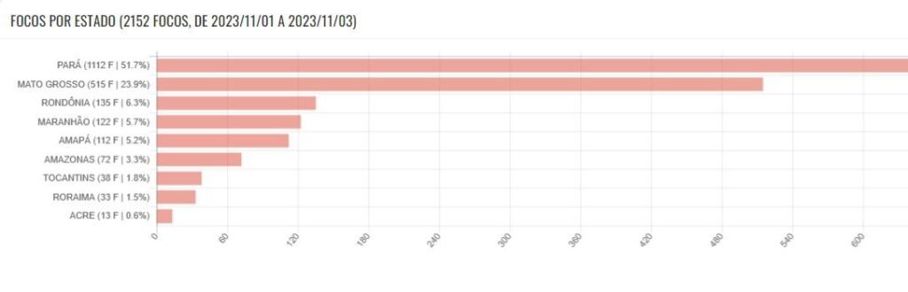 De acordo com o Inpe, de 26 de outubro, até ontem (3), 5.305 focos foram registrados no estado do Pará e, em menor intensidade, na Região Metropolitana de Manaus (RMM), onde no mesmo período foram registrados 149 focos.