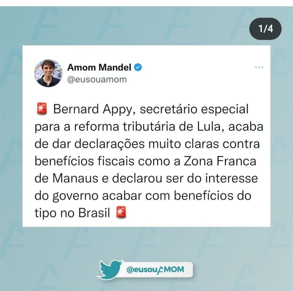 “Bernard Appy, secretário especial para a reforma tributária de Lula, acaba de dar declarações muito claras contra benefícios fiscais como a Zona Franca de Manaus e declarou ser do interesse do governo acabar com benefícios do tipo no Brasil”, disse Amom.
