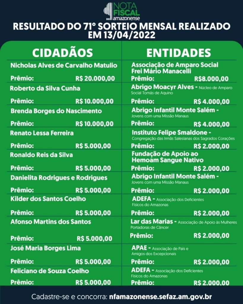 A Secretaria de Estado de Fazenda (Sefaz-AM) divulgou a relação com os nomes dos cidadãos e entidades sociais vencedores do 71º Sorteio Mensal da Campanha Nota Fiscal Amazonense. O sorteio foi transmitido ao vivo pelo Sistema de Rádio e TV Encontro das Águas.
