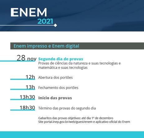 Este será o segundo Enem aplicado neste ano, já que as provas de 2020 foram adiadas por causa da pandemia e acabaram sendo aplicadas em janeiro e fevereiro.