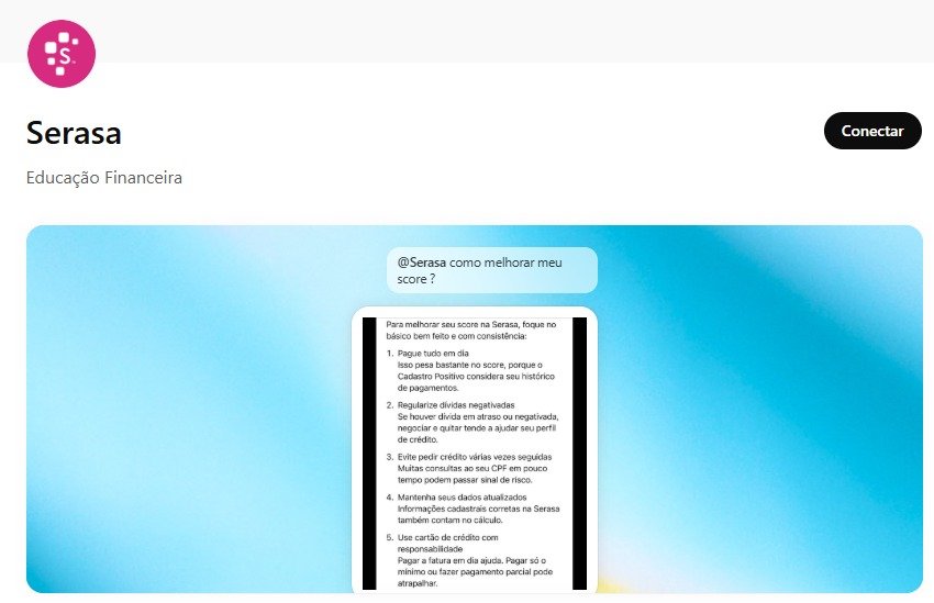 Pioneira entre as empresas do setor financeiro brasileiro, a Serasa passa a permitir que os usuários interajam diretamente com a marca em uma jornada fluida, personalizada e orientada por respostas mais precisas e confiáveis com o app no ChatGPT. Ao mesmo passo, a inovação também acompanha o posicionamento da empresa, que reforça a importância da educação financeira e busca ampliar o acesso à informação, de forma didática e segura.