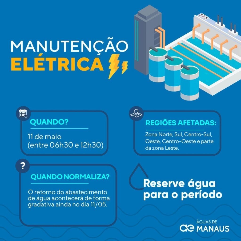 A Águas de Manaus informa que devido manutenção elétrica programada pela Amazonas Energia as Estações de Tratamento de Águas (ETA) I e II, localizadas no complexo Ponta do Ismael, no bairro Compensa, zona Oeste da cidade, serão temporariamente desligadas, nesta quinta-feira (11), deixando sem abastecimento as regiões Norte, Sul, Centro-Sul, Oeste, Centro-Oeste e parte da zona Leste da cidade.