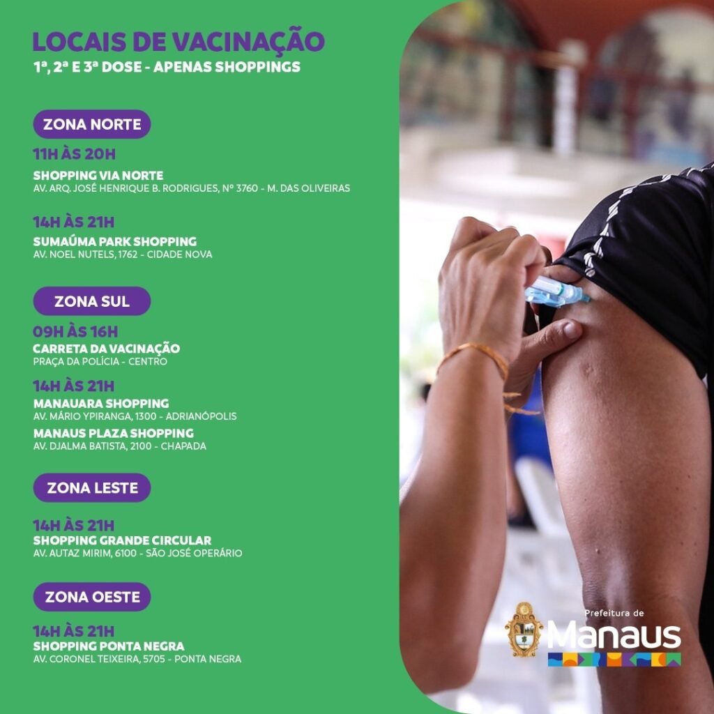 A campanha de vacinação contra a Covid-19 segue neste domingo (12) em sete pontos de Manaus. Postos estão funcionando nos shoppings centers da capital amazonense e a carreta de vacinação está estacionada na na Praça da Polícia, no Centro da cidade, funcionando até às 16h. No shopping ViaNorte, na zona Norte, a vacinação vai até às 20h, e no Sumaúma Parque e nos outros centros de compras o atendimento vai até às 21h.