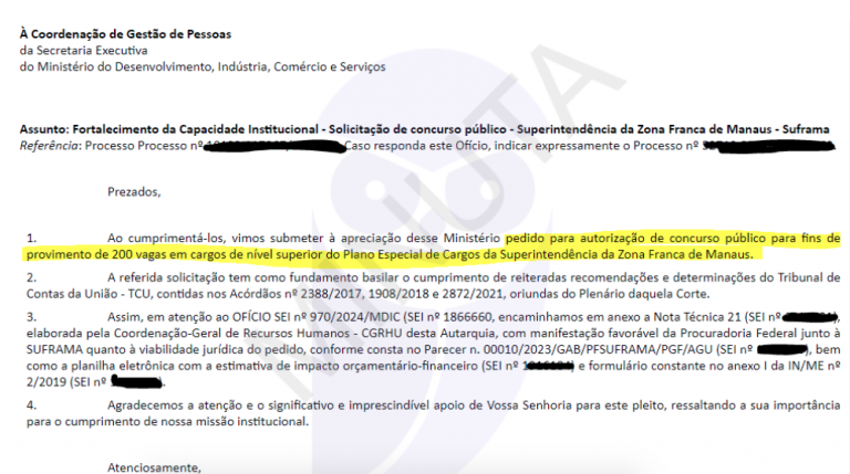 O ofício que confirma a solicitação de vagas foi assinado pelo superintendente João Bosco Gomes Saraiva e encaminhado ao Ministério do Desenvolvimento, Indústria, Comércio e Serviços.