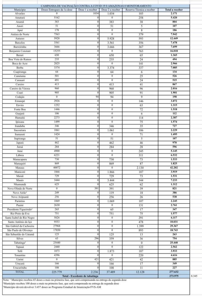Após o cálculo de todos os grupos, de acordo com critérios do Ministério da Saúde e cruzamento com os dados do Amazonas, houve uma sobra de 8.345 doses, que serão redistribuídas de acordo com determinação dos Informes Técnicos do Ministério da Saúde.