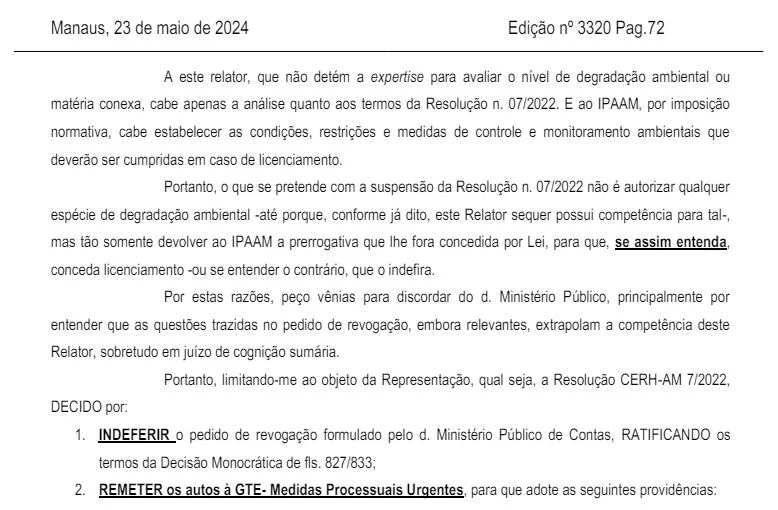 No entanto, no entendimento do conselheiro a decisão não impõe que o Ipaam conceda indiscriminadamente licenciamento. “A decisão, em verdade, apenas suspende os efeitos de ato administrativo que tem impossibilitado o exercício de direito dos Representantes. Nesse contexto, não há o que se falar em ‘direito de poluir’, quando o que se discute é tão somente o direito de se requerer junto ao órgão competente a autorização para determinada atividade.