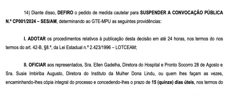 O auditor-relator do Tribunal de Contas do Amazonas (TCE-AM) Luiz Henrique Pereira Mendes suspendeu, cautelarmente, o Edital de Chamamento Público nº 002/2024 – SES/AM para firmar Contrato de Gestão com entidade qualificada como Organização Social para gerenciamento, operacionalização e execução das ações e serviços de saúde no âmbito do Complexo Hospitalar Zona Sul (CHZS), que abrange o Hospital e Pronto Socorro 28 de Agosto e o Instituto da Mulher Dona Lindu.