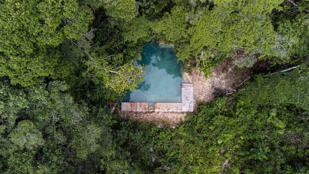 Ao fim da trilha de 200 metros você pode se refrescar nas águas com belos tons de azul e cerca de 2,5 metros de profundidade.