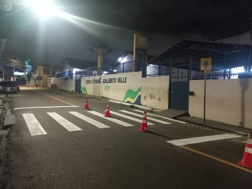 Dando continuidade ao cronograma de sinalização viária na capital, a Prefeitura de Manaus, por meio do Instituto Municipal de Mobilidade Urbana (IMMU), segue com a implantação e revitalização de pinturas horizontais e sinalização em vias estratégicas, especialmente em frente a unidades de ensino. O objetivo é garantir mais segurança aos pedestres e orientar os motoristas, reduzindo riscos em áreas de grande circulação de estudantes.