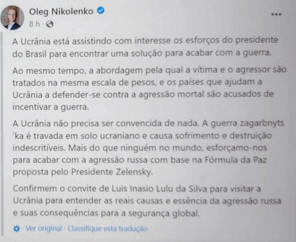 Nikolenko ressaltou ainda que “a Ucrânia observa com interesse os esforços do presidente do Brasil para encontrar uma solução que ponha fim à guerra”.