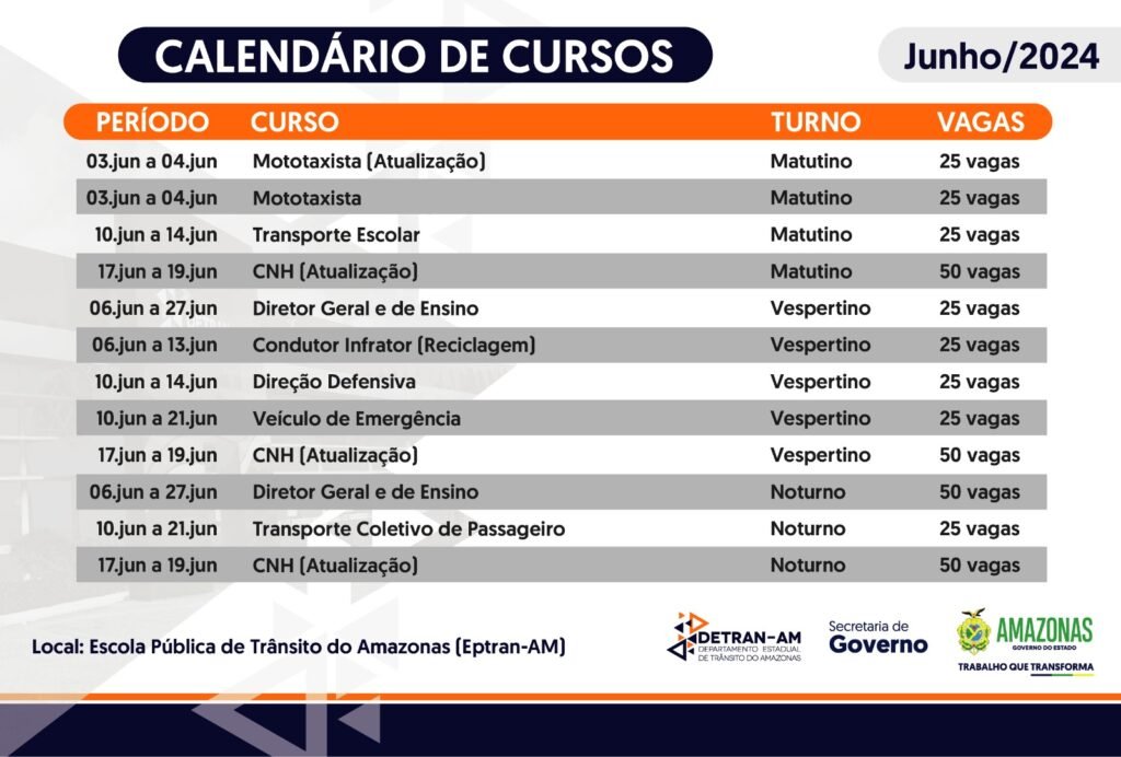 A Escola Pública de Trânsito (Eptran), por meio do Departamento Estadual de Trânsito do Amazonas (Detran-AM), está com inscrições abertas para nove cursos que serão realizados ao longo do mês de junho de 2024.