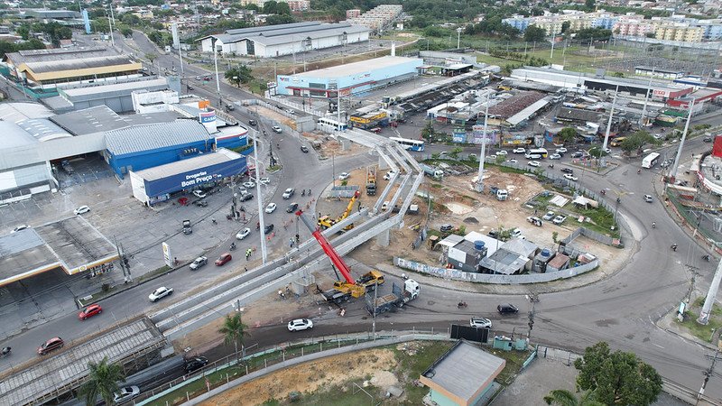 O Viaduto Rei Pelé, na Bola do Produtor, em fase de construção pela Prefeitura de Manaus, na zona Leste, ganha forma após 18 vigas implantadas. Nesse domingo (31), as equipes finalizaram o transporte e a instalação das peças em trechos das avenidas Autaz Mirim e Camapuã.