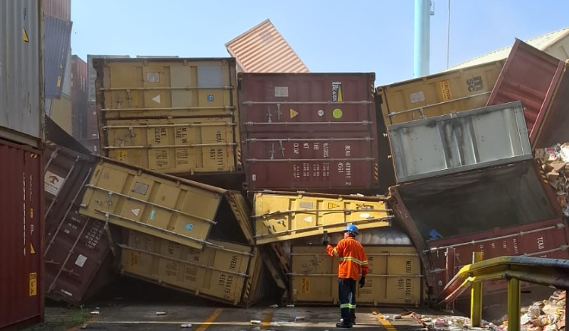 No vídeo, a pessoa que grava expressa alívio, comentando que, por sorte, os containers caíram para o lado oposto da área de tráfego de pessoas e equipamentos.