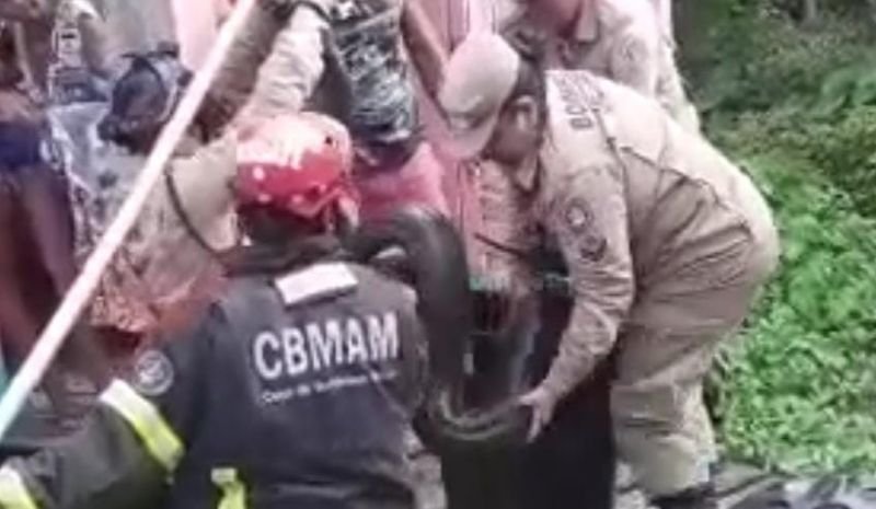 Um vídeo que circula nas redes sociais mostra o impressionante momento em que uma sucuri de aproximadamente quatro metros é capturada por uma equipe do Corpo de Bombeiros Militar do Amazonas. O caso aconteceu no bairro Aida Mendonça, no município de Presidente Figueiredo (a 117 quilômetros ao norte de Manaus).