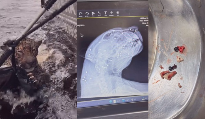 Uma onça macho foi resgatada no Rio Negro, nas proximidades da praia da Ponta Negra, zona oeste de Manaus, na tarde de quarta-feira (1º). Ela nadava aparentemente desnorteada. O animal estava ferido na cabeça com chumbinho, munição de arma de caça. Foram encontrados 30 projéteis no corpo da onça, que perdeu alguns dentes.