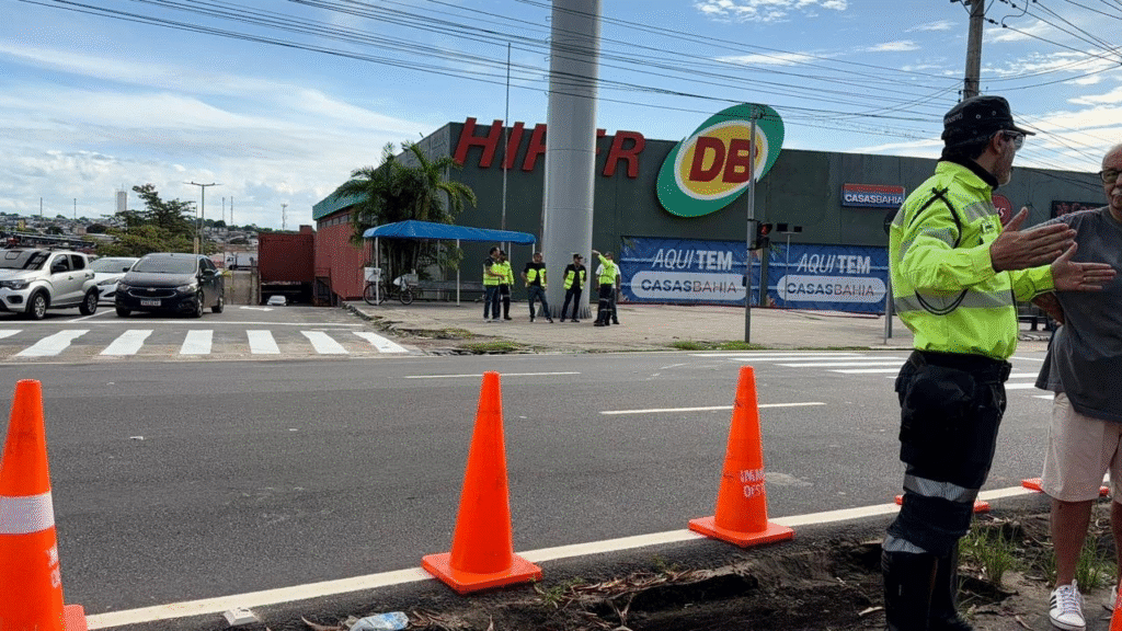 Agentes de trânsito do Instituto Municipal de Mobilidade Urbana (IMMU) da Prefeitura de Manaus estão na manhã desta terça-feira (17), na Avenida Coronel Teixeira, em frente ao Supermercado Hiper DB, onde reabrem um retorno para os motorisras que trafegam no sentido Centro-Ponta Negra, em substituição ao existente que foi fechado para obras no Complexo Viário Passarão, na altura da Avenida Brasil.