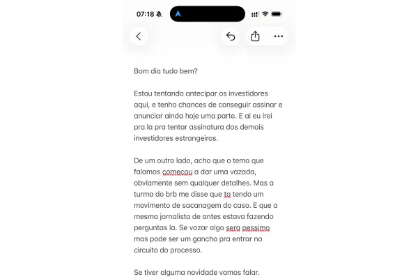 Às 7h18: Bom dia tudo bem? Estou tentando antecipar os investidores aqui, e tenho chances de conseguir assinar e anunciar ainda hoje uma parte. E ai eu irei pra la pra tentar assinatura dos demais investidores estrangeiros.