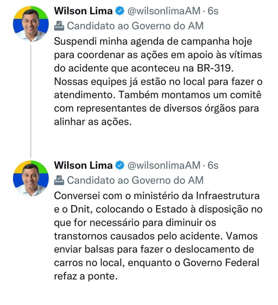 O governador Wilson Lima (União Brasil), candidato à reeleição, suspendeu a agenda de campanha, desta quarta-feira (28), para coordenar pessoalmente as ações de resgate e apoio às vítimas do acidente ocorrido na BR-319 (Manaus-Porto VElho), na manhã desta quarta-feira (28), na altura do km 12, no município do Careiro da Varzea, na Região Metropolitana de Manaus.