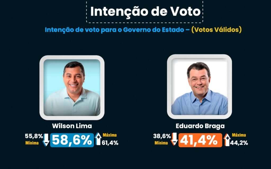 Nova pesquisa de intenção de votos sobre a corrida ao Governo do Estado mostra que, se a eleição fosse hoje, o governador Wilson Lima (UB) seria reeleito com vantagem de 17,2 pontos percentuais sobre seu adversário, Eduardo Braga (MDB).