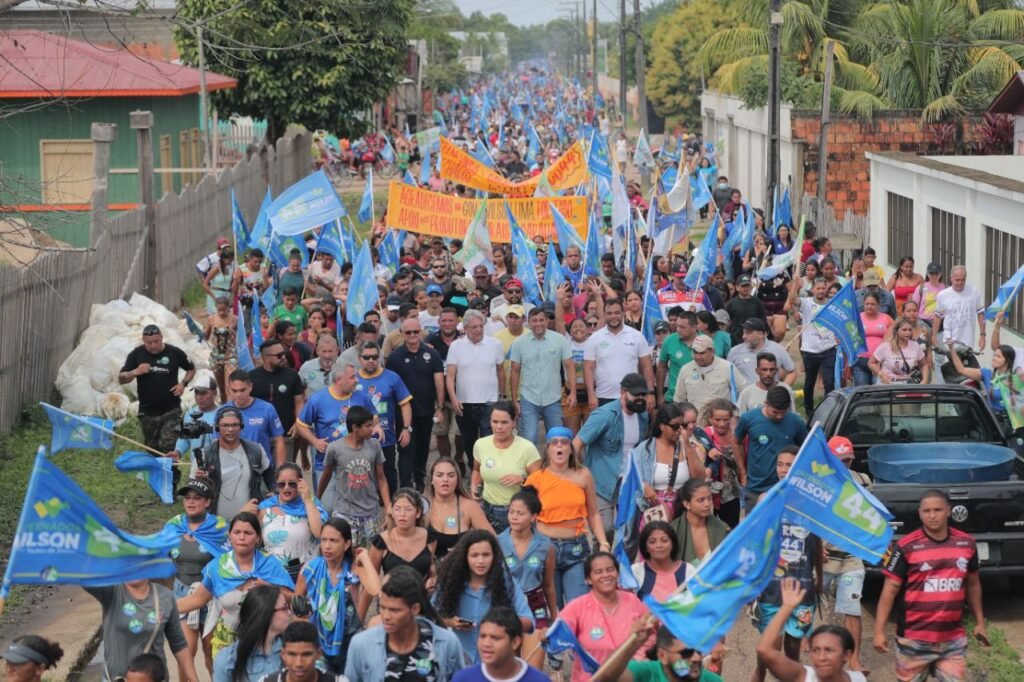 O candidato à reeleição pelo União Brasil, governador do Amazonas Wilson Lima, reuniu 5 mil pessoas em Carauari (a 788 km de Manaus), neste domingo (18). Ao som do jingle de campanha, a população caminhou ele pelas ruas da cidade, antes de um comício no qual ele assumiu compromissos para novos investimentos no município.